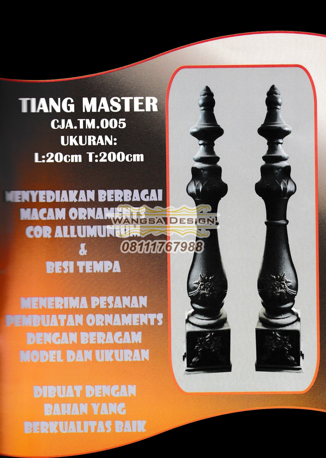 Wangsa Design adalah perusaahan yang bergerak di bindang Wrought Iron atau Besi Tempa. Selain kami kontraktor besi tempa, kami juga menyuplai Ornamen Besi Tempa, Akesoris Besi Tempa, Ekoran, daun, center point ke bengkel las / workshop yang membutuhkan ornamen besi tempa. Karena tidak semua bengke las dapat membuat ornamen tempa sendiri.